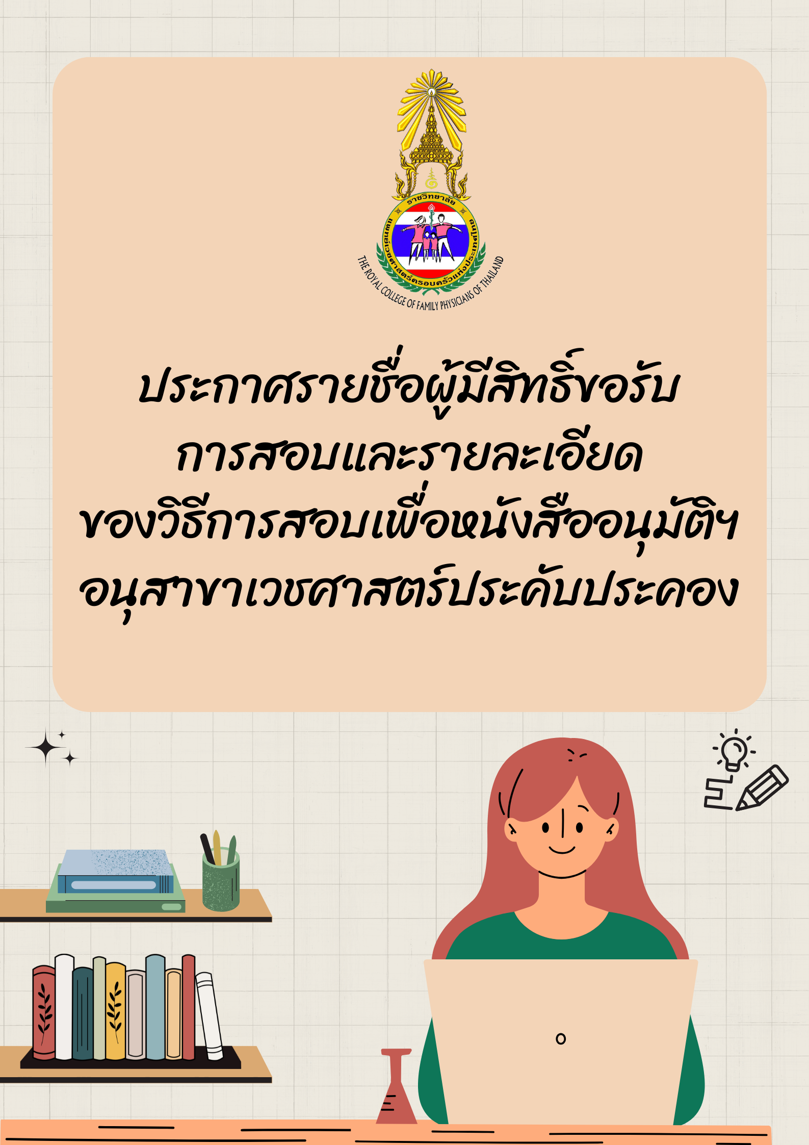 ประกาศรายชื่อผู้มีสิทธิ์ขอรับการสอบ และรายละเอียดของวิธีการสอบ เพื่อหนังสืออนุมัติฯ อนุสาขาเวชศาสตร์ประคับประคอง