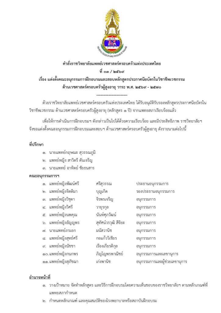 คำสั่งแต่งตั้งคณะอนุกรรมการฝึกอบรมและสอบหลักสูตรประกาศนียบัตรในวิชาชีพเวชกรรมด้านเวชศาสตร์ครอบครัวผู้สูงอายุ วาระ พ.ศ. 2569-2570