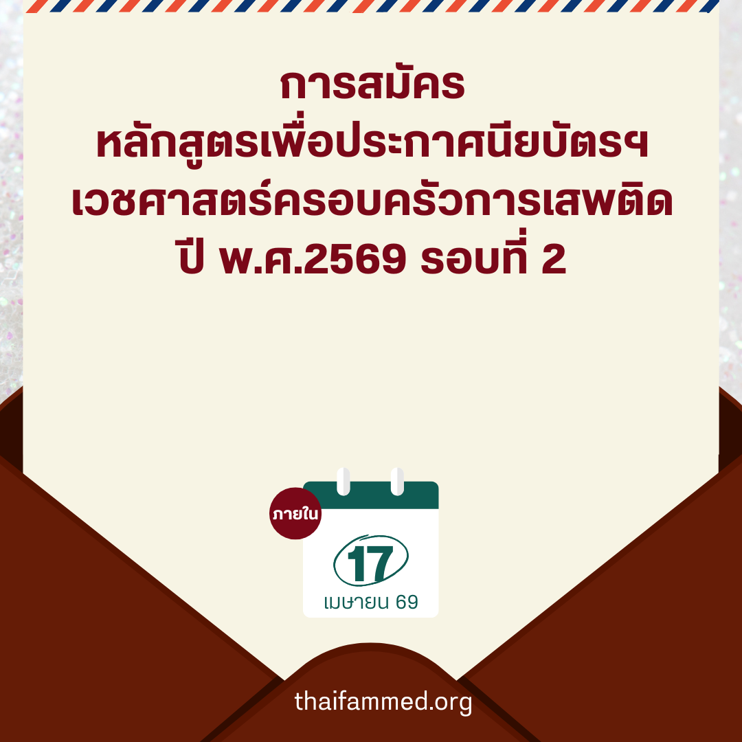 การสมัครหลักสูตรเพื่อประกาศนียบัตรในวิชาชีพเวชกรรม ด้านเวชศาสตร์ครอบครัวการเสพติด ประจำปีการฝึกอบรม พ.ศ. ๒๕๖๙ รอบ ๒