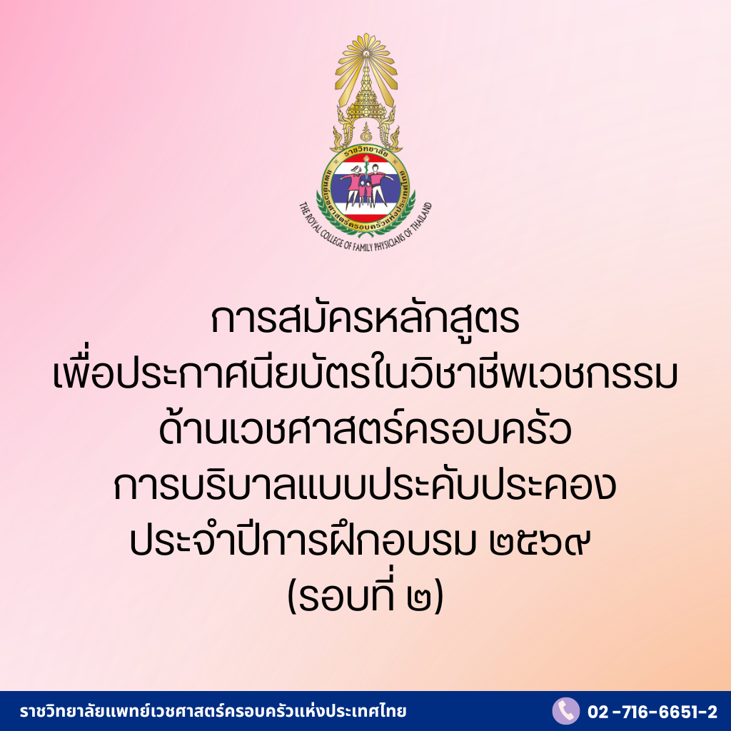 การสมัครหลักสูตรเพื่อประกาศนียบัตรในวิชาชีพเวชกรรม ด้านเวชศาสตร์ครอบครัวการบริบาลแบบประคับประคองประจําปีการฝึกอบรม ๒๕๖๙ รอบที่ ๒