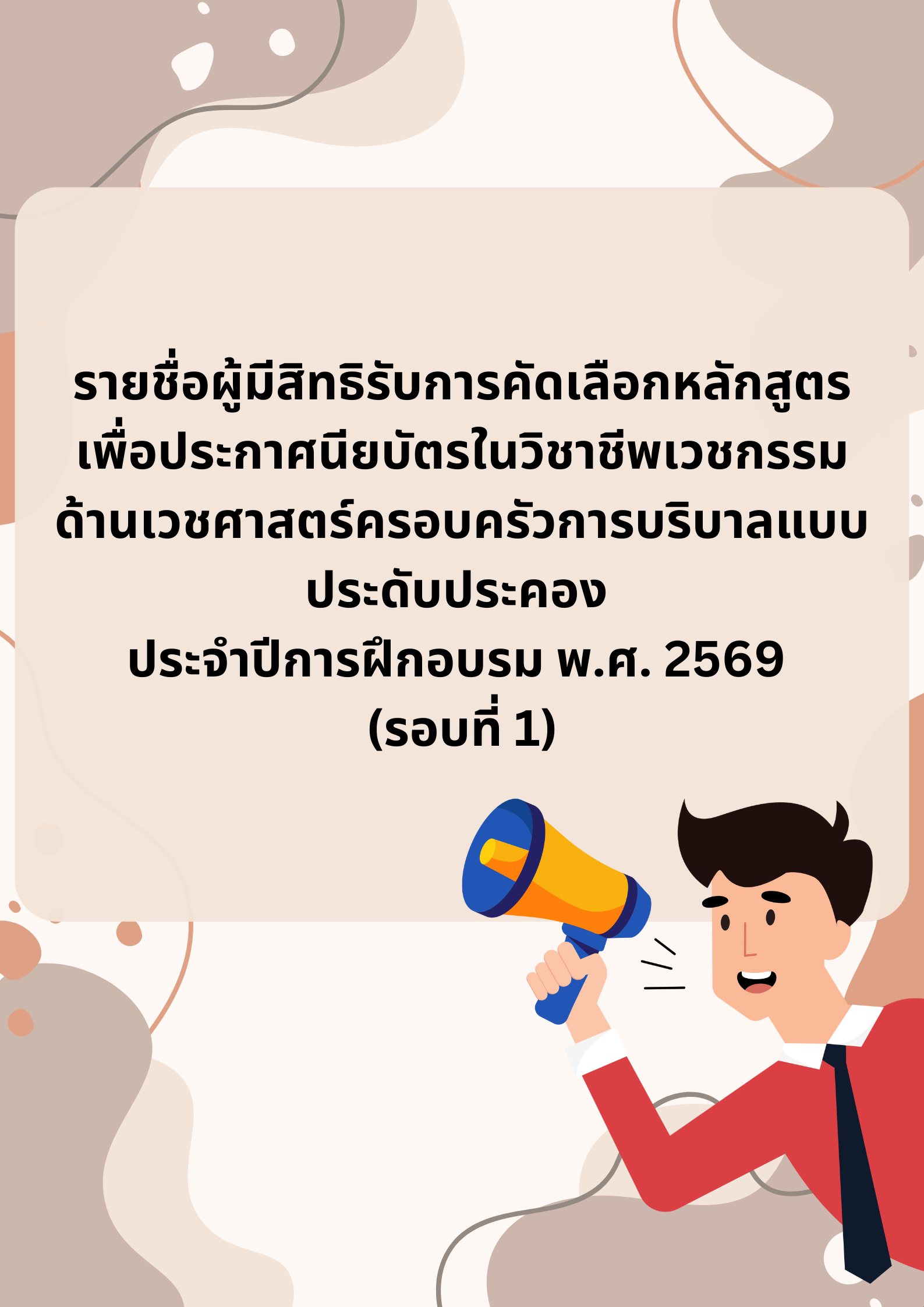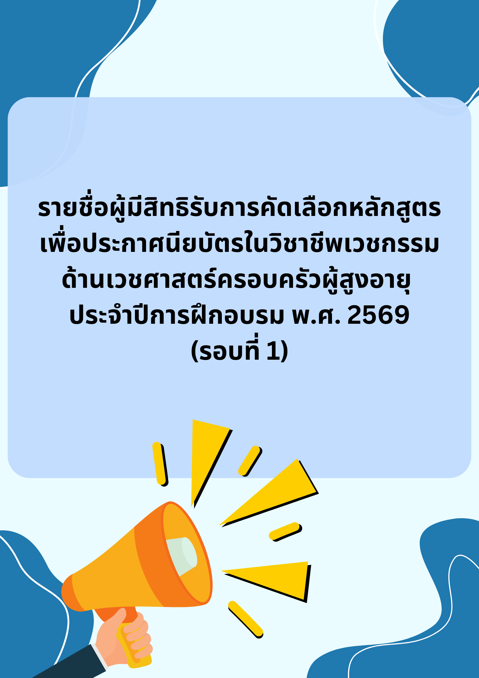 รายชื่อผู้มีสิทธิรับการคัดเลือกหลักสูตร เพื่อประกาศนียบัตรในวิชาชีพเวชกรรม ด้านเวชศาสตร์ครอบครัวผู้สูงอายุ ประจำปีการฝึกอบรม พ.ศ. 2569 (รอบที่ 1)