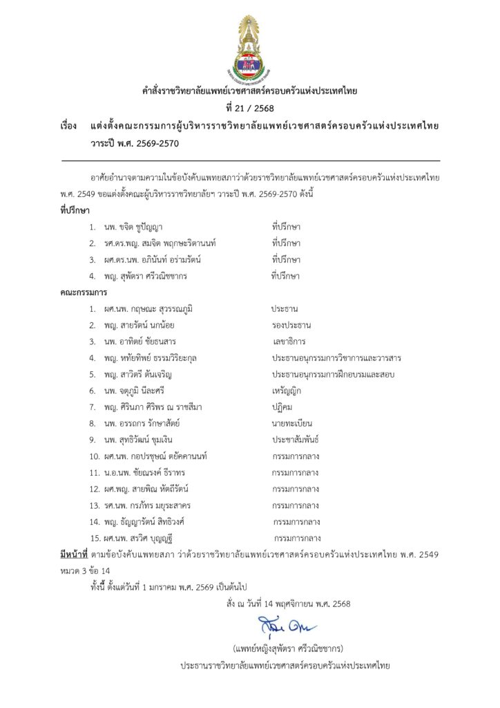 คำสั่งแต่งตั้งคณะกรรมการผู้บริหารราชวิทยลัยแพทย์เวชศาสตร์ครอบครัวแห่งประเทศไทย วาระปี พ.ศ.2569-2570
