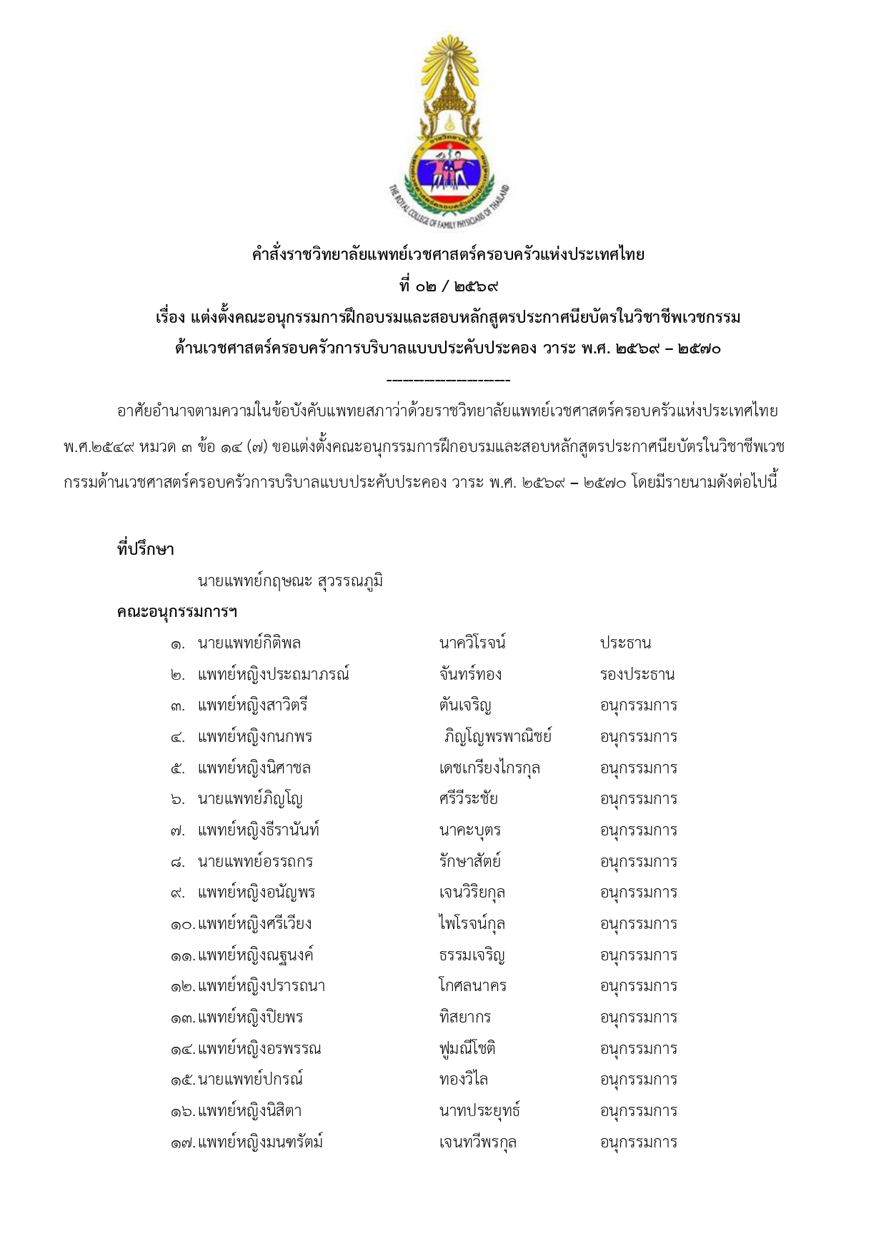 คำสั่งแต่งตั้งคณะอนุกรรมการฝึกอบรมและสอบหลักสูตรประกาศนียบัตรในวิชาชีพเวชกรรม ด้านเวชศาสตร์ครอบครัวการบริบาลแบบประคับประคอง วาระ พ.ศ. 2569-2570