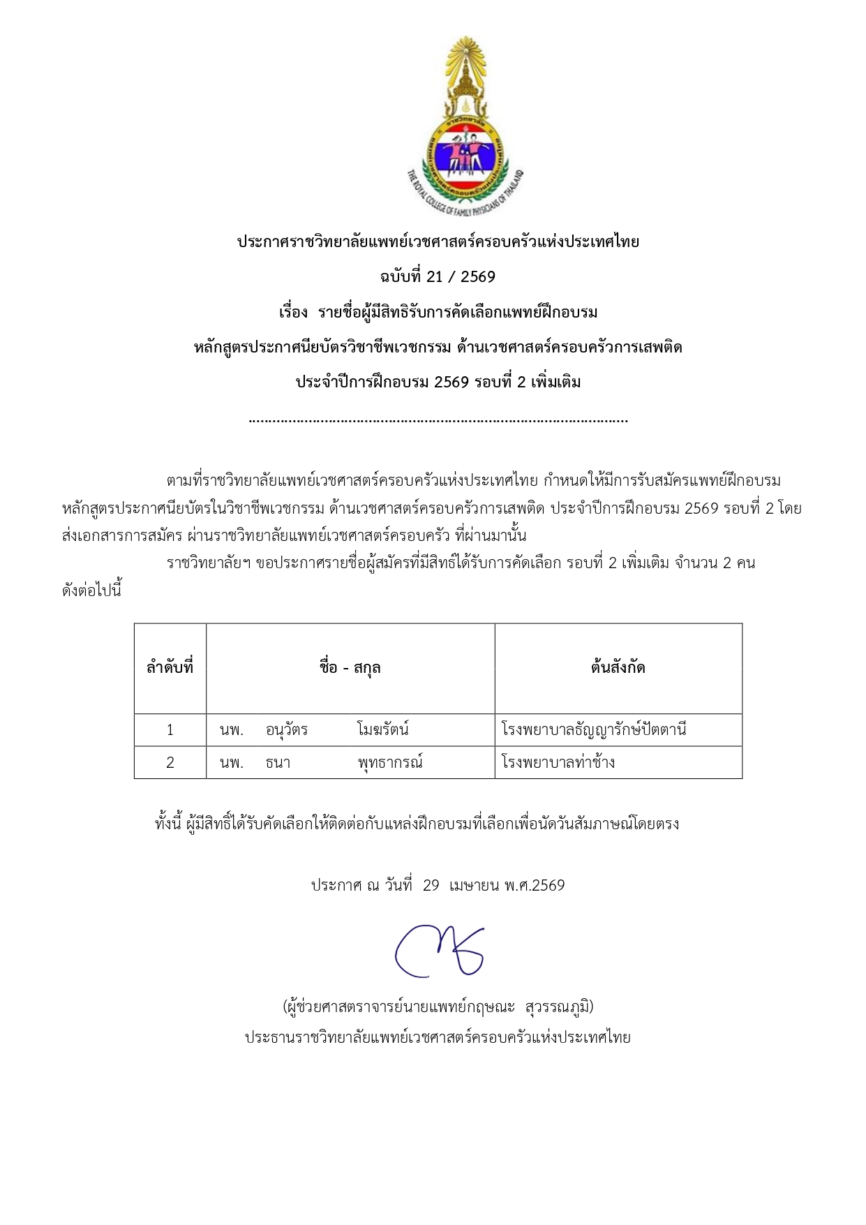 ประกาศรายชื่อผู้มีสิทธิรับการคัดเลือกแพทย์ฝึกอบรม หลักสูตรประกาศนียบัตรวิชาชีพเวชกรรม ด้านเวชศาสตร์ครอบครัวการเสพติด ประจำปีการฝึกอบรม 2569 รอบที่ 2 (เพิ่มเติม)